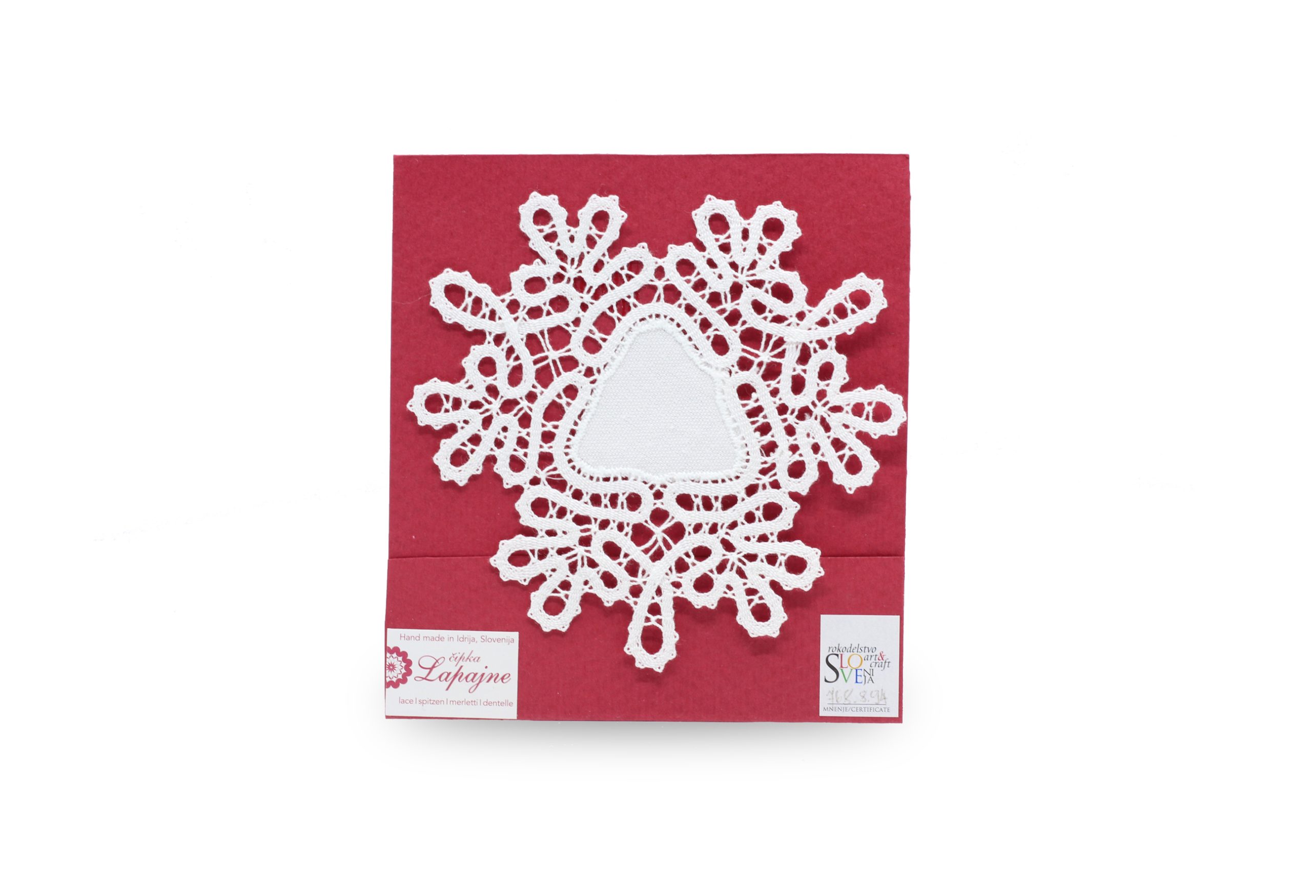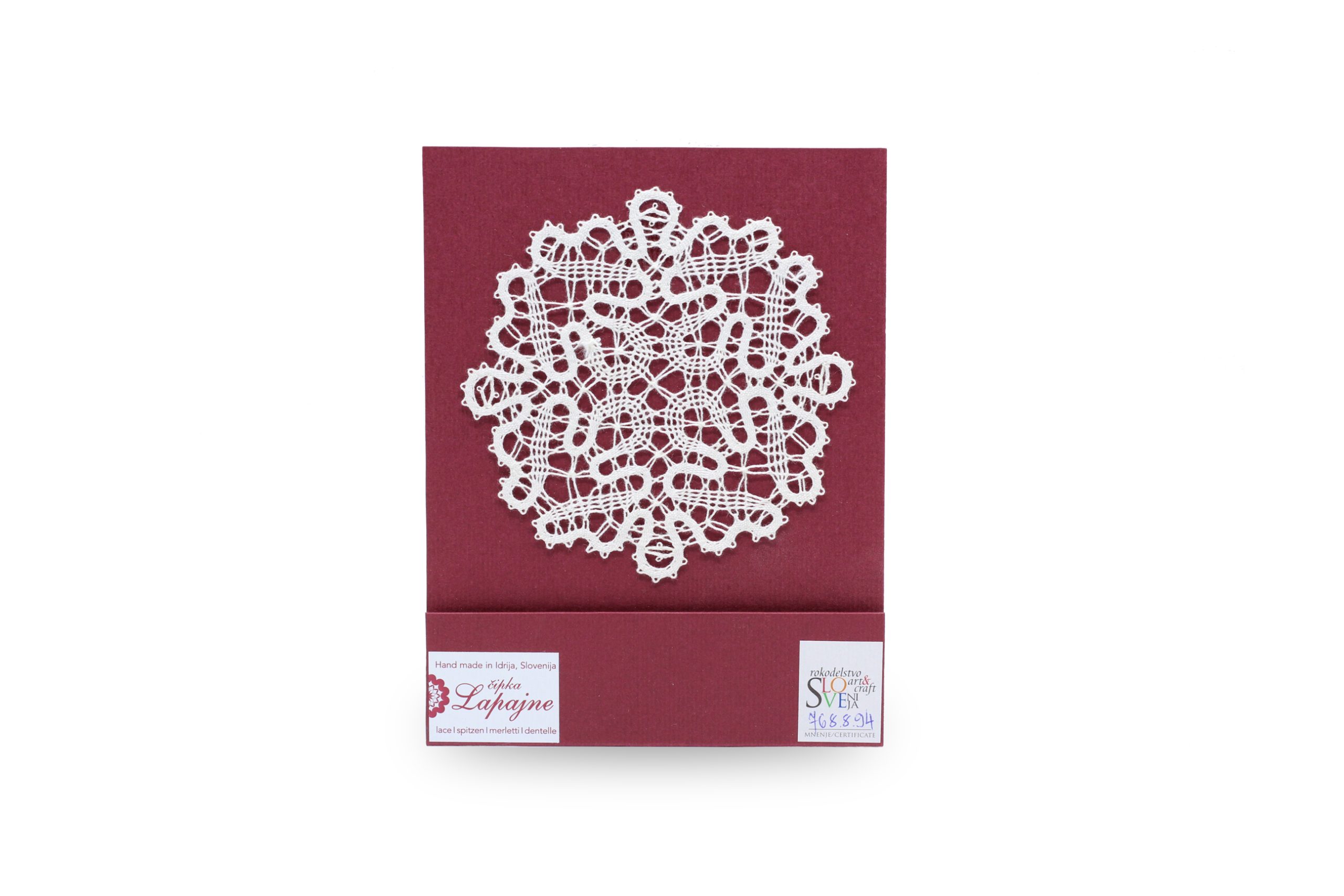 Prtiček cela čipka pr.9 cm,100% bomb. 12. Prtiček cela čipka pr.8 cm,100% bomb. 13. Prtiček cela čipka pr.9 cm 100% bomb. 15. Ovalček,cela čipka 15×10 cm,100% bomb. 16. Prtiček bomb./lan pr. 10 cm. 17. Prtiček cela čipka pr.12 cm 18. Prtiček bomb./lan pr.12 cm Vsi izdelki so izdelani iz 100% bombažne nitke. Pri vseh izdelkih,kjer je 100% bomb.nitka je to poseben sukanec,ki je narejen samo za izdelavo čipk in ga kupujemo pri proizvajalcu v Italiji.